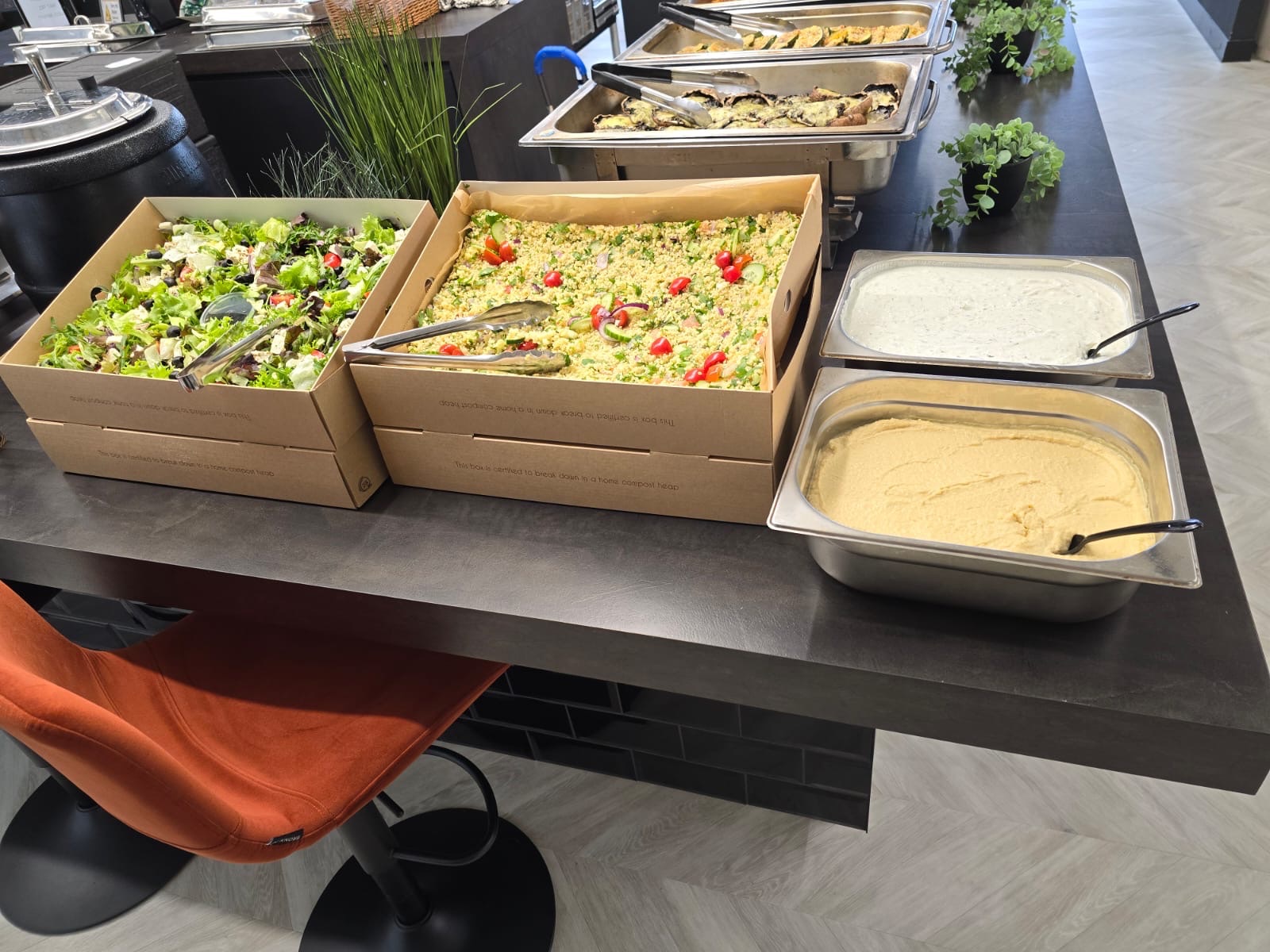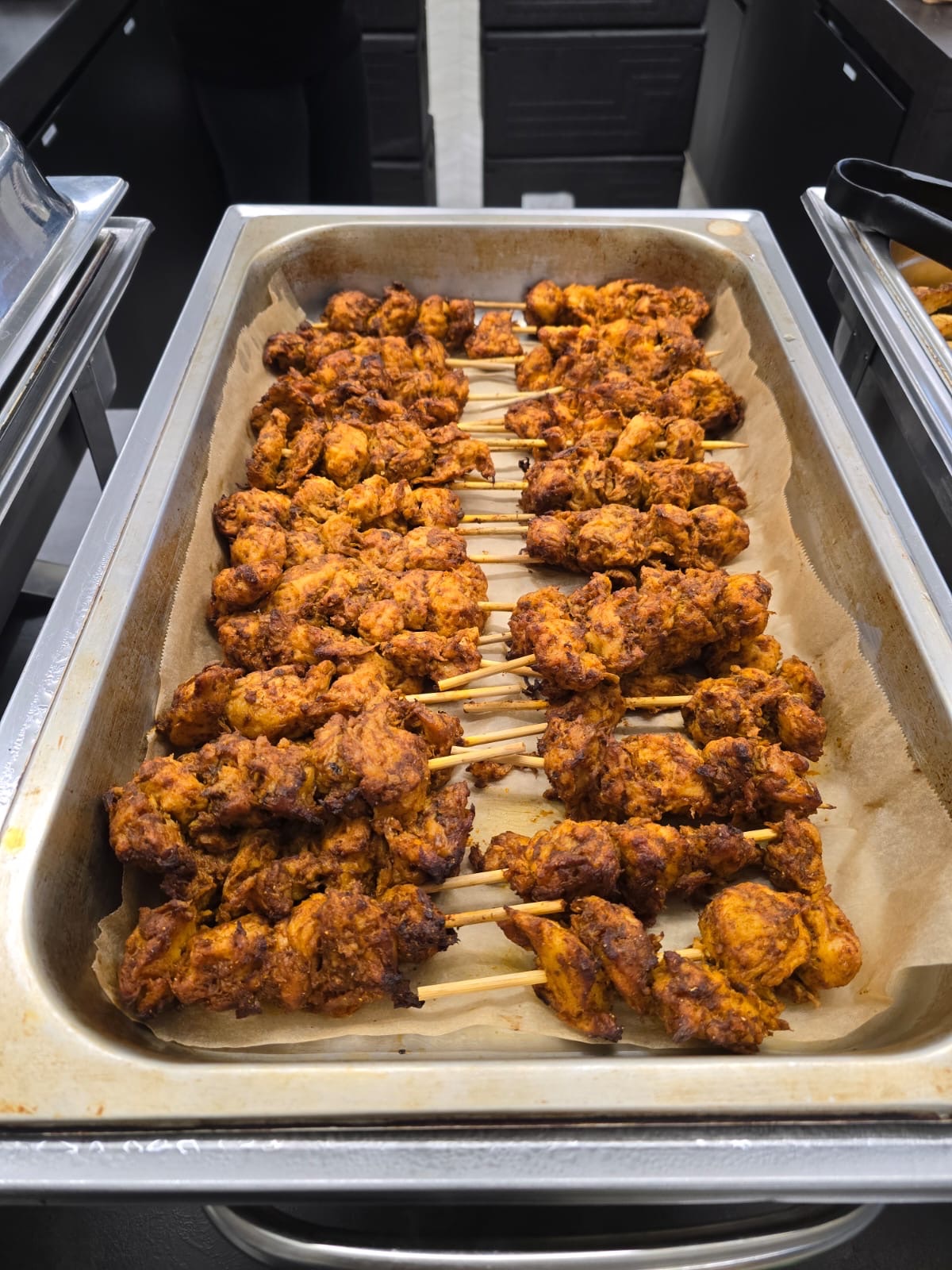 Another monthly team lunch for Enra and hoping that the Sun gods would approve the team chose a Mediterranean themed lunch for this occasion. This menu included Grilled Chicken Kulbasti, Schicken skewers, Stuffed Courgettes with Oat Crumb, Mushrooms filled with Mediterranean Veg and Cheese, Tabbouleh Top Notch style plus a huge selection of accompaniments flatbreads, pilaf rice, tzatziki and hummus. And as if this wasn’t enough there was a hearty sponge pudding with lashings of custard to keep everyone happy!